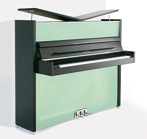 Vitrea的材料:立面是毛玻璃制,包含多个色调。通过细长的铬边嵌入。共鸣盘、顶盖和键盘单元采用橡木制作。有明亮的天然木色调和深色调可供选择。所有材料都是高光镀铬。